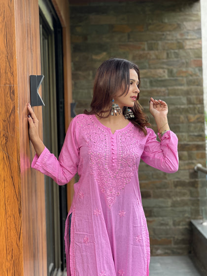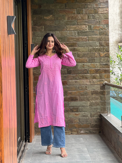 Long chikan kurtas are the embodiment of elegance and grace. The long sleeves add a timeless, modest appeal that is appropriate for both formal and casual settings. Chikan embroidery is an ancient art form that offers tremendous detail and artistic appeal. Whether you choose delicate butis or intricate jaal patterns, a chikan kurta improves every outfit.