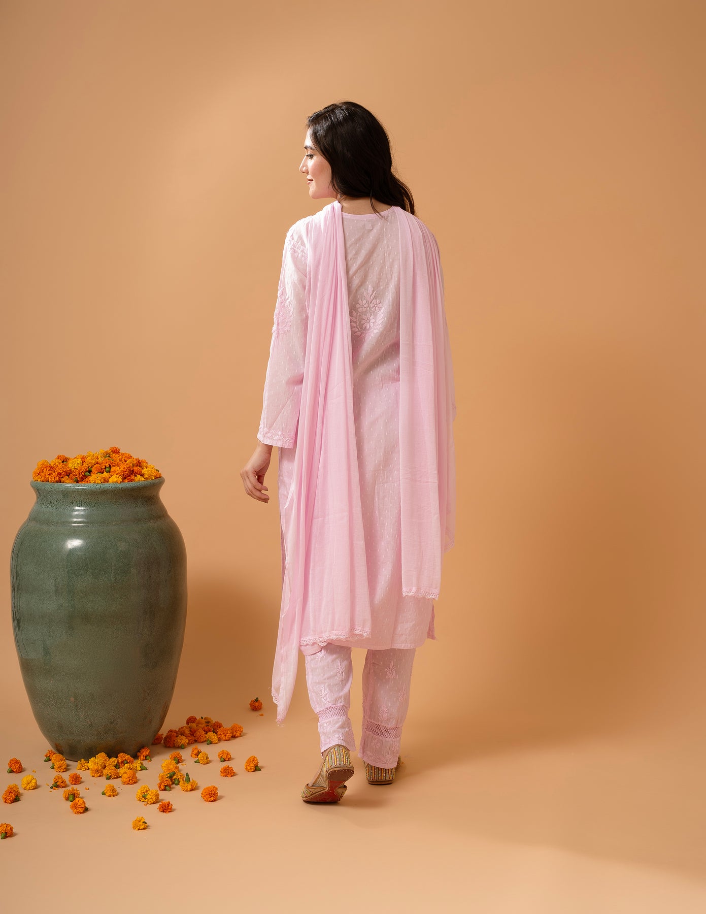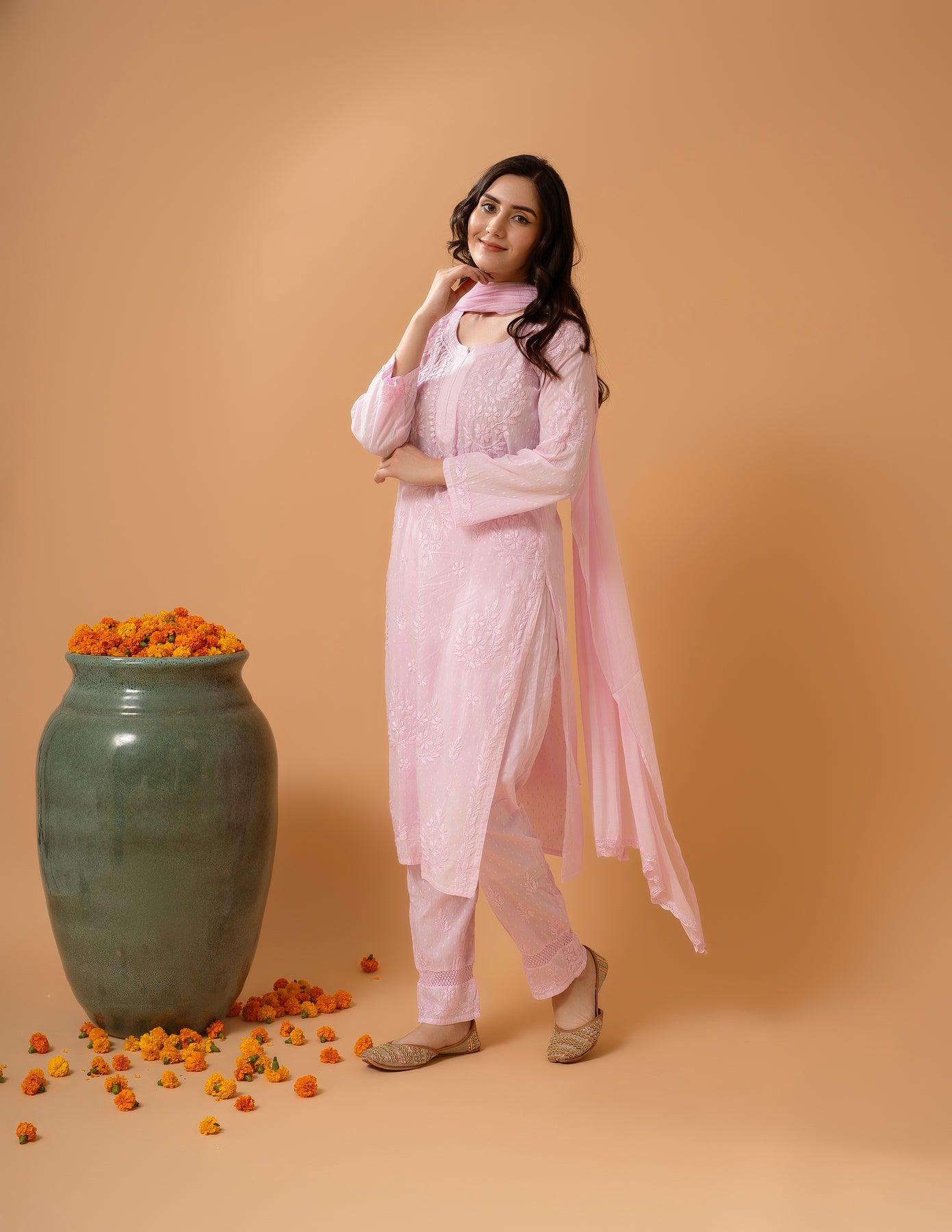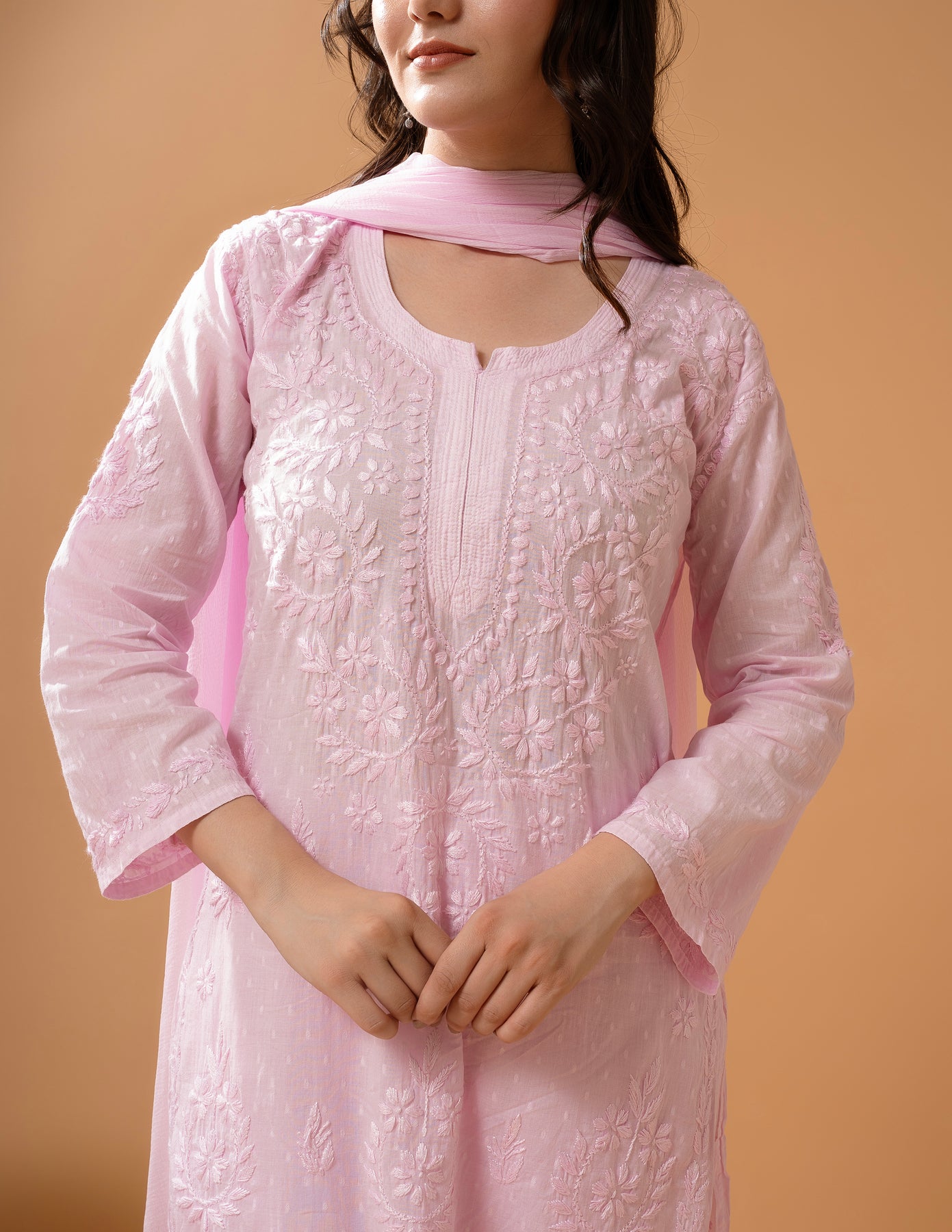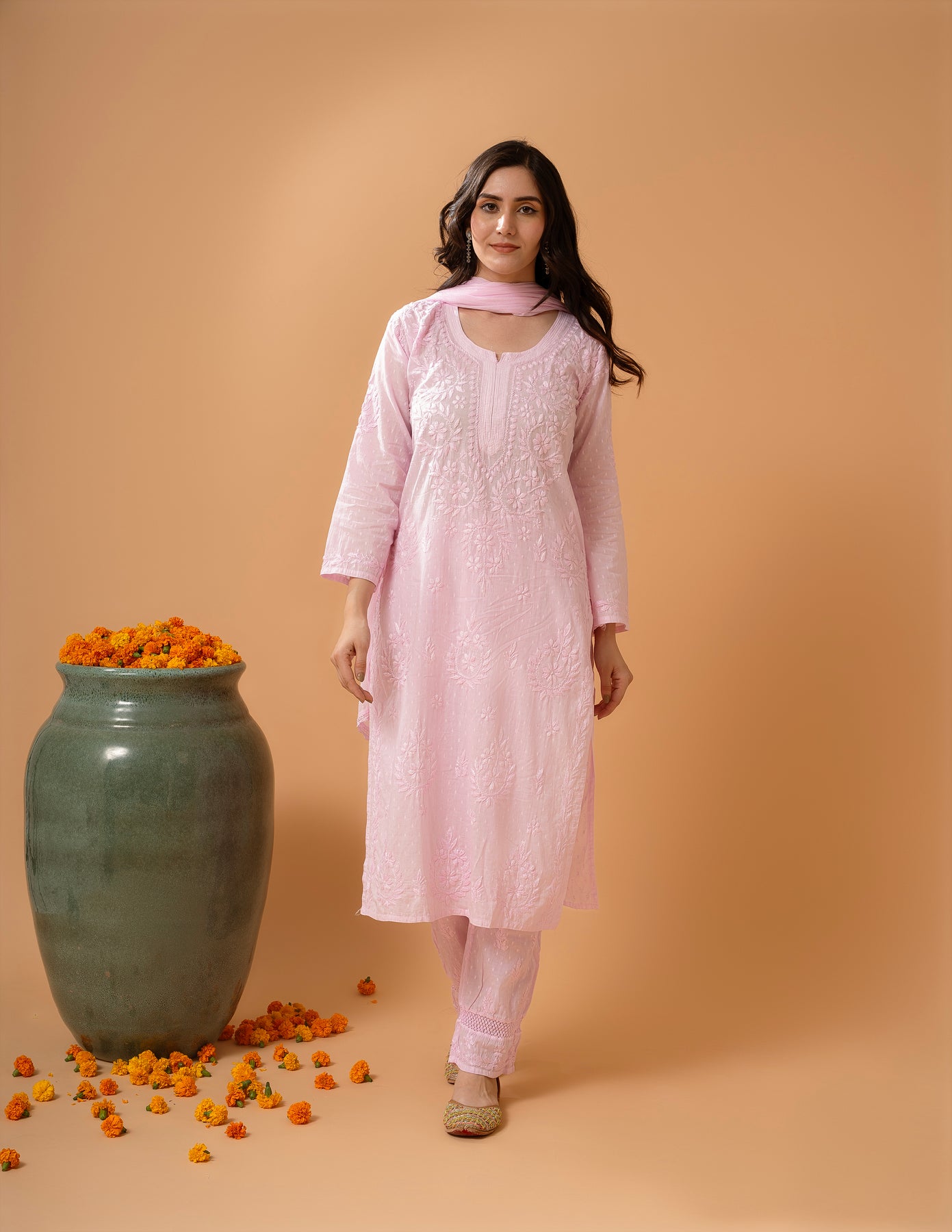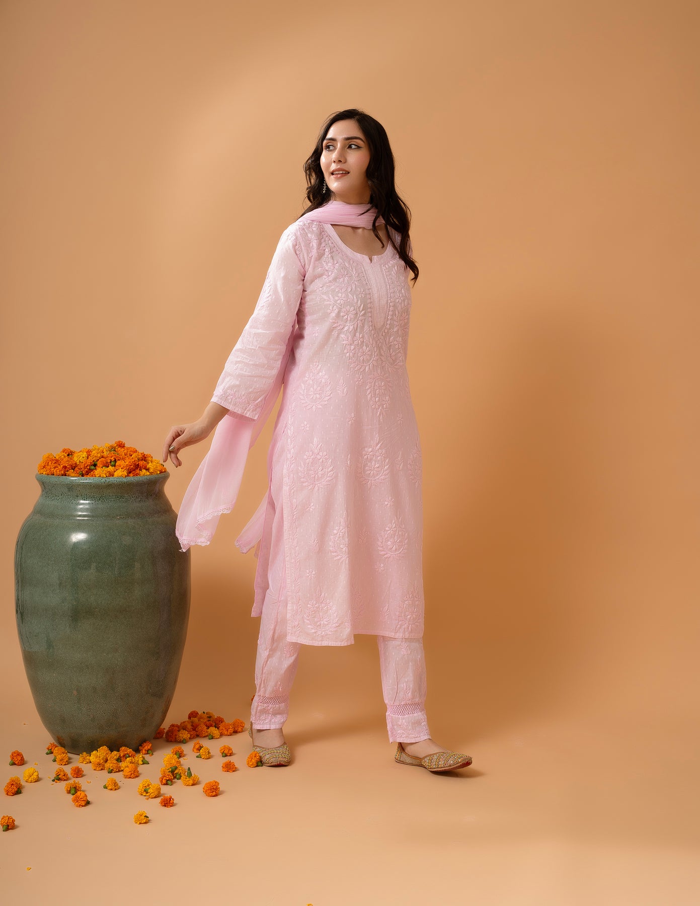 Chikankari is an Art of delicate handwork of Lucknow. It is a handcrafted process where the wooden blocks are manually carved in various designs, and the natural stew for printing is prepared, and printed on the cloth. The chikankari craftsmen then use ten ary of the needlecraft embroidery, and perform the needlework artistically. There are 32 stitches of chikankari broadly classified into Raised stitch, Embossed and Flat stitch.