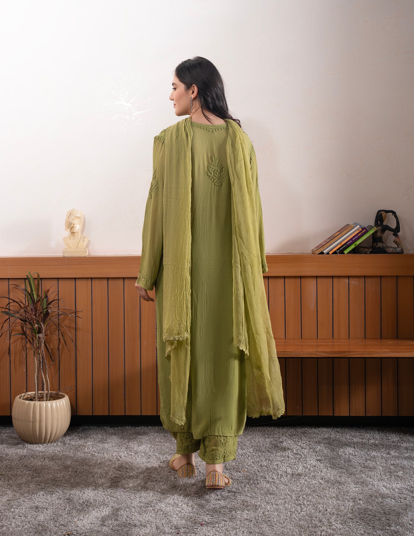 Chikankari is an Art of delicate handwork of Lucknow. It is a handcrafted process where the wooden blocks are manually carved in various designs, and the natural stew for printing is prepared, and printed on the cloth. The chikankari craftsmen then use ten ary of the needlecraft embroidery, and perform the needlework artistically. There are 32 stitches of chikankari broadly classified into Raised stitch, Embossed and Flat stitch.
