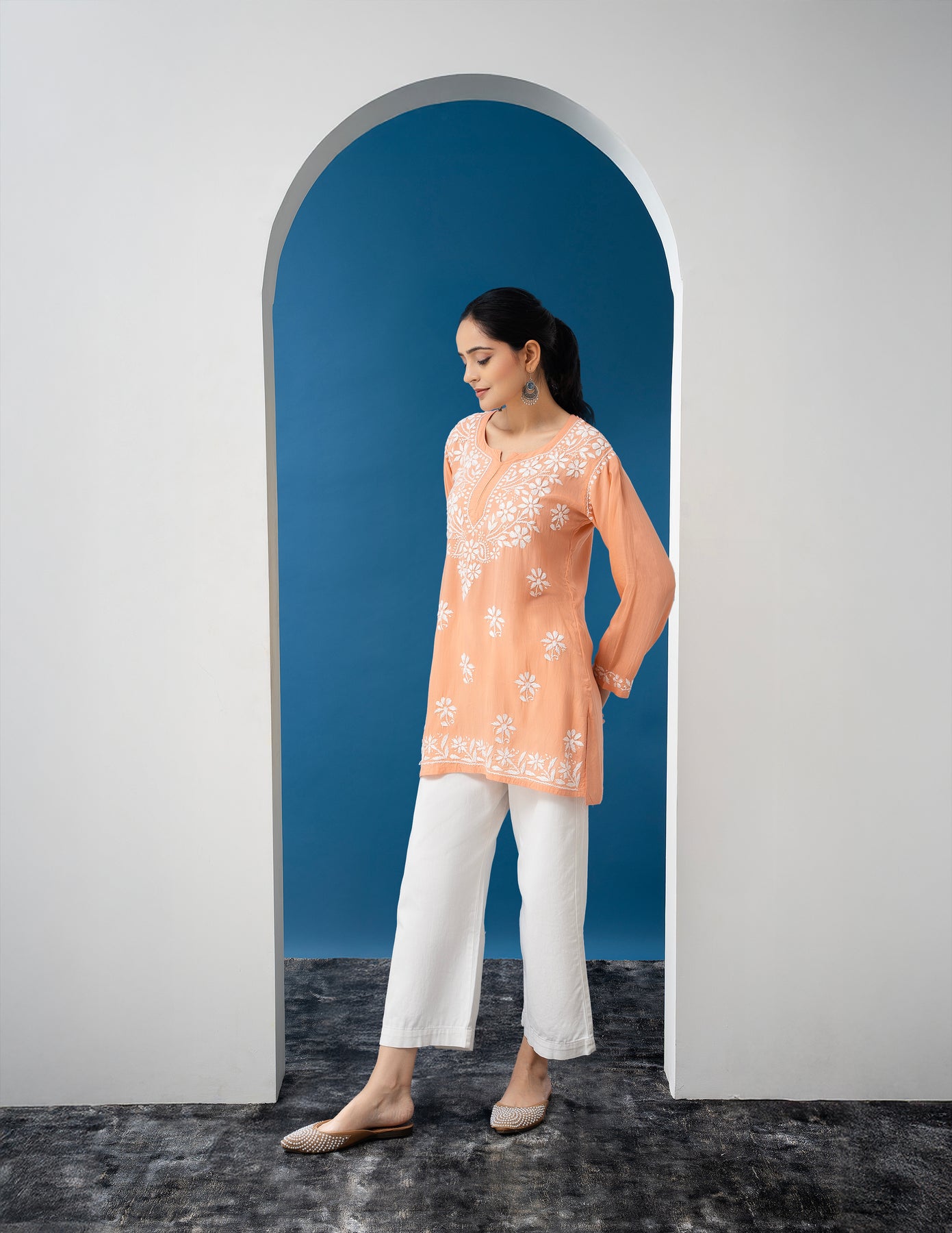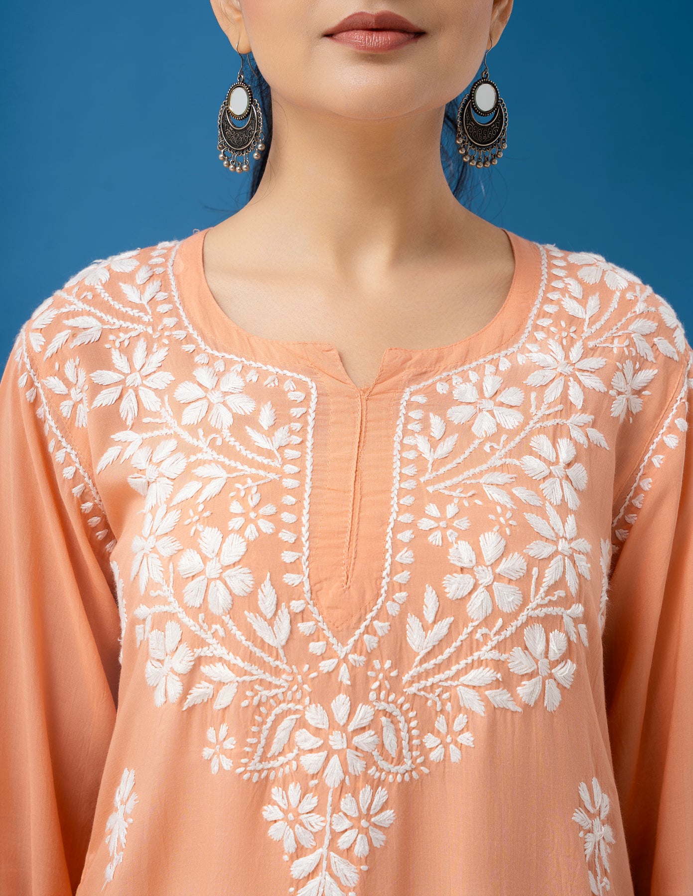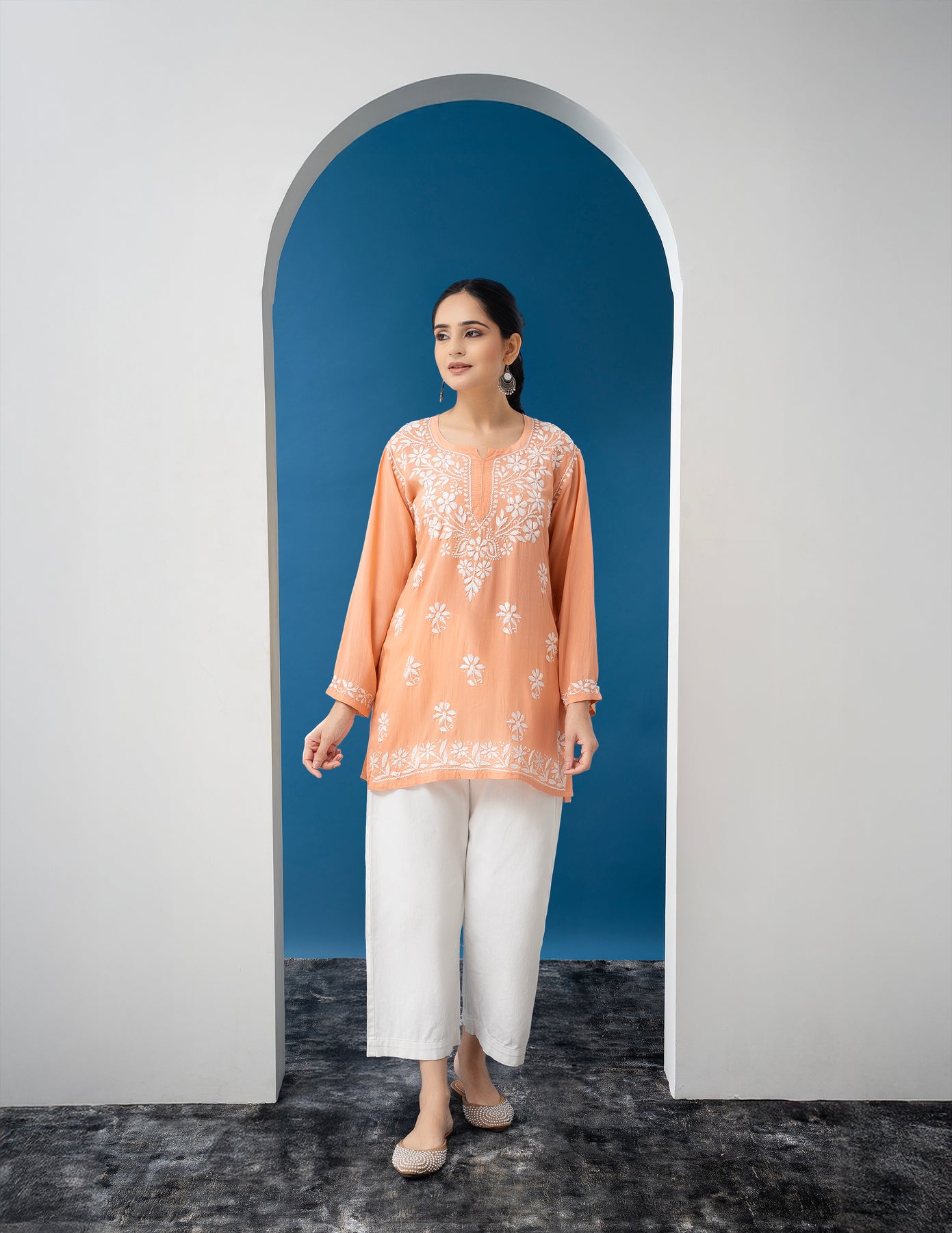 Modal Chikankari Solid Women's Short Kurta - Peach